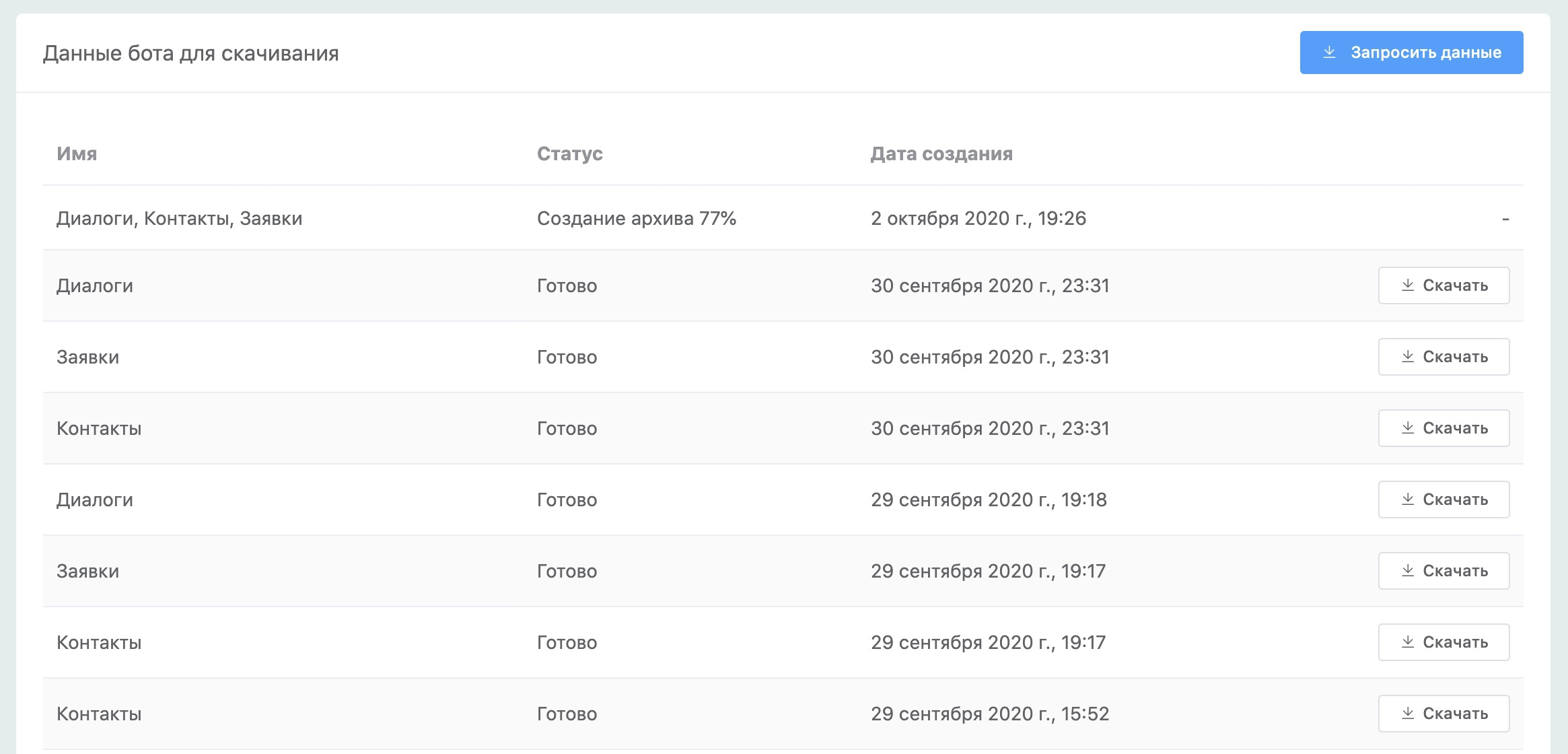 Улучшили создание архивов для скачивания данных бота: контакты, заявки, сообщения. Раньше при большом объеме данных генерация файла Excel могла зависнуть, теперь скрипт может обработать любое количество данных ограниченное лишь лимитами формата Excel. Так же при создании архива показывается прогресс его архивации.