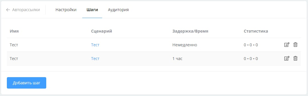 Интерфейс управления шагами авторассылки