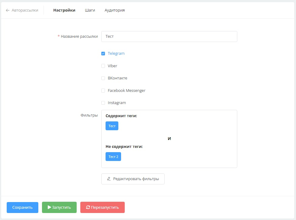 - Выберите мессенджеры для которых будет осуществляться рассылка. Клиент получит сообщение только в том мессенджере, через который он написал боту.