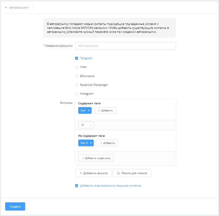 Интерфейс создания авторассылки