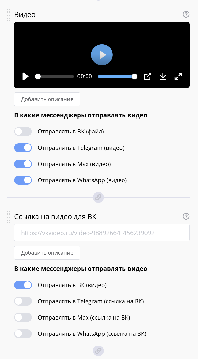 Каждый тип видео в разные мессенджеры отправляется по-разному. Если ваш чат-бот — кроссплатформенный, то рекомендуем указать, в какие мессенджеры отправлять видео. Например, для ВК-видео включите мессенджер ВКонтакте, для Видеосообщения — Telegram, а для обычного видео включите все мессенджеры кроме ВКонтакте.