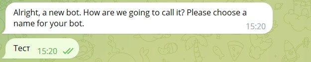 5) In the response message, send the name of your bot. It can be in any language and does not need to be unique. In this case, we sent the name "Test"
