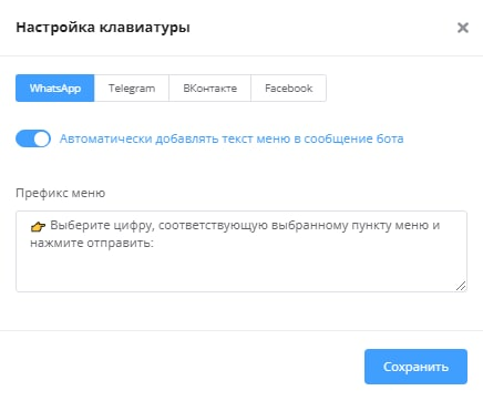 Thus, menu items will be added to the bot message in text form. You can also add a menu prefix that will be inserted before menu items.