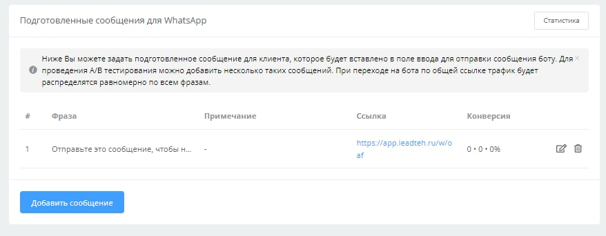 Setting up automatic WhatsApp bot launch only by prepared message in LEADTEX.