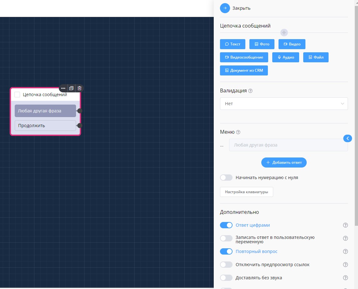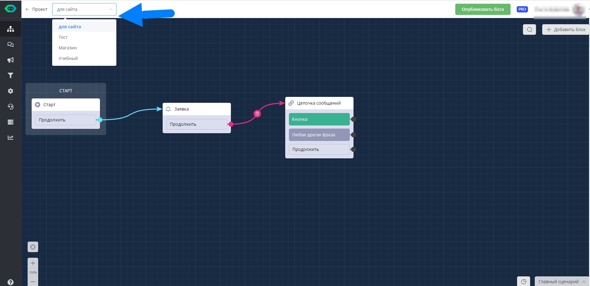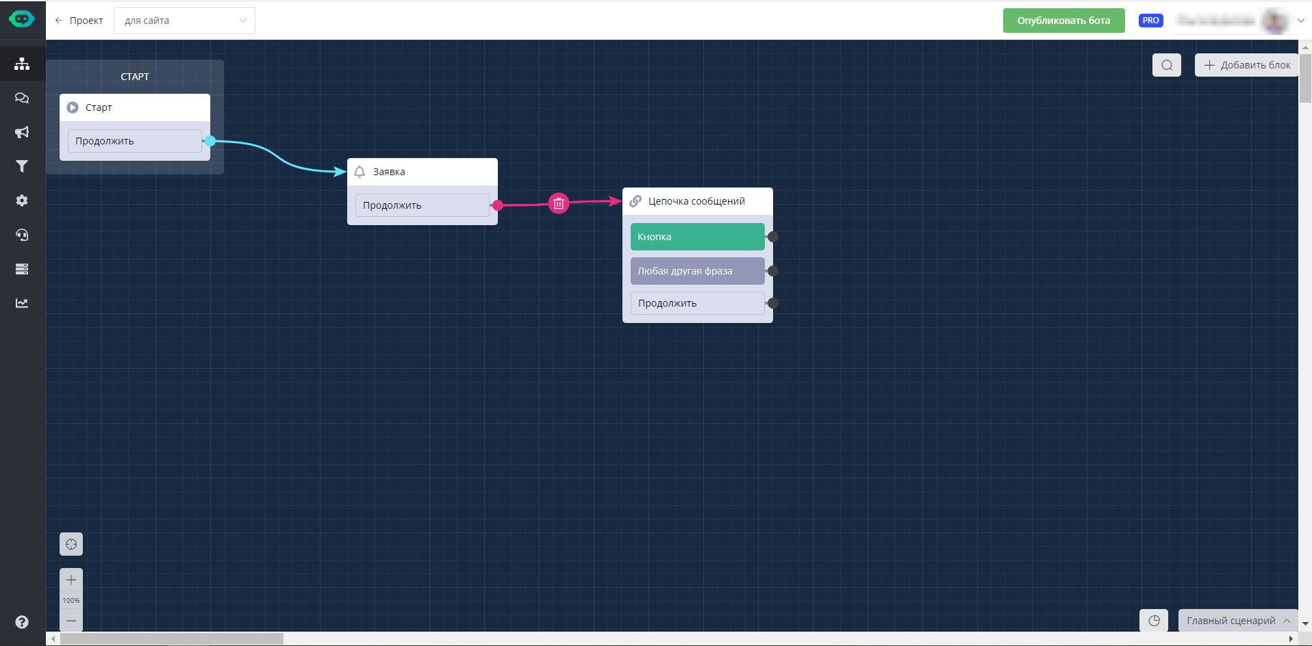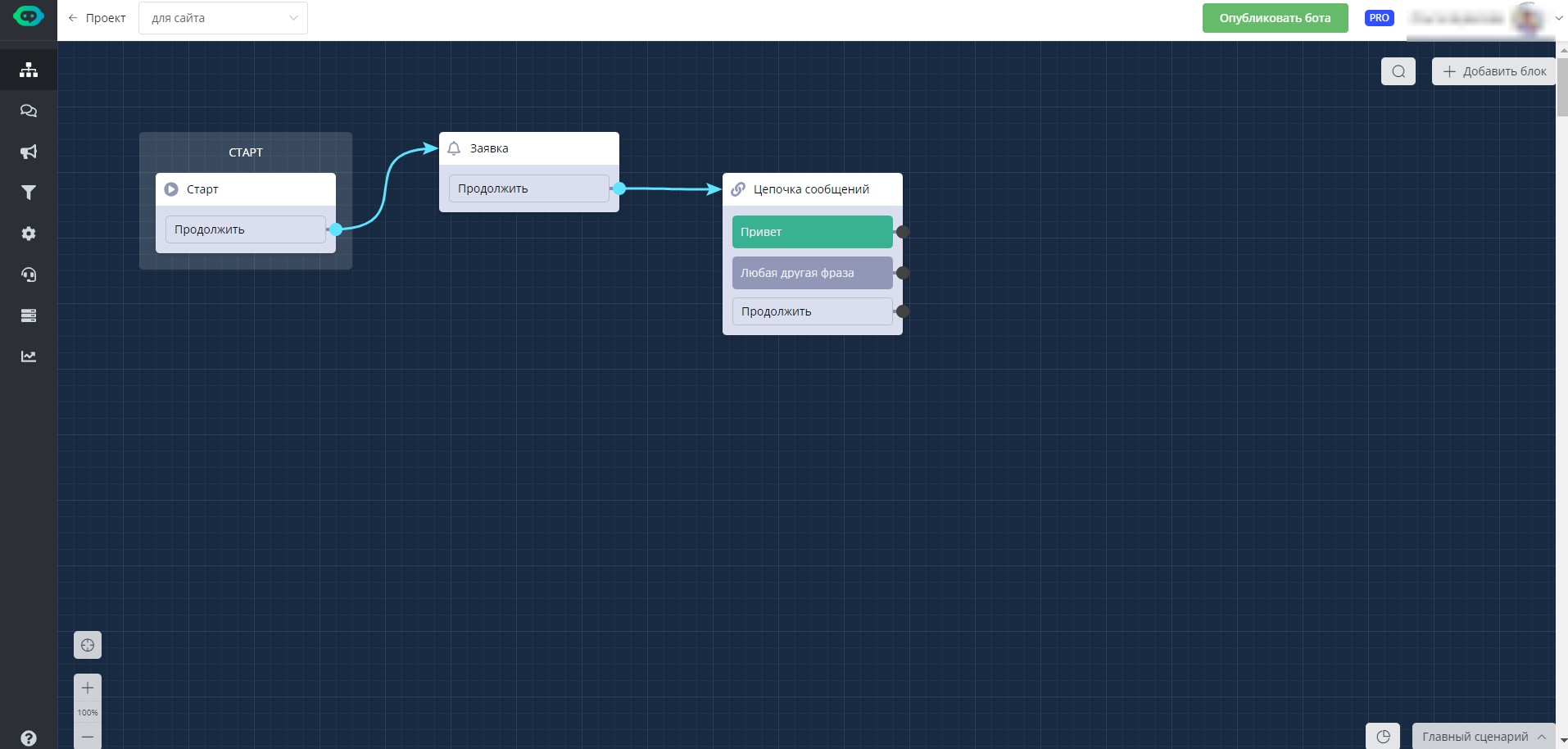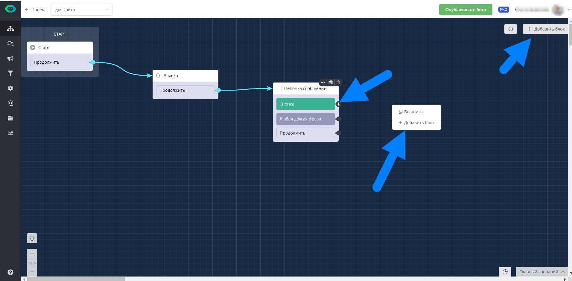 How to create scenarios for chat bot in LEADTEX: visual constructor, message blocks, conditions and transitions