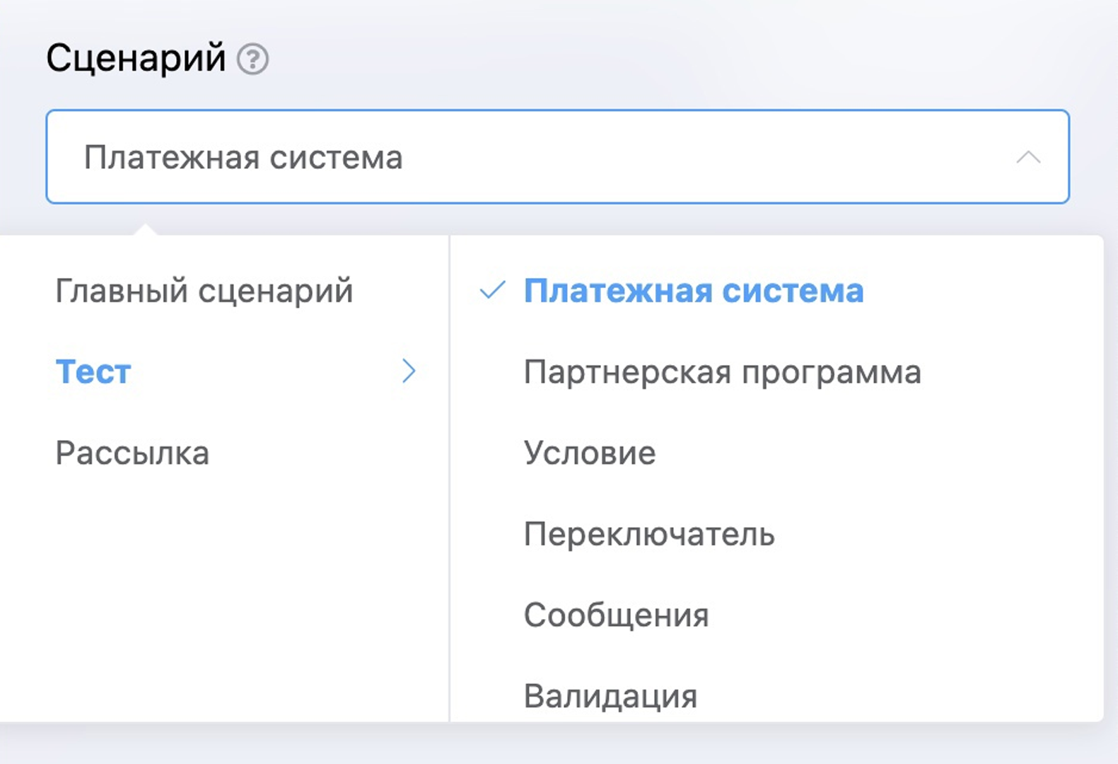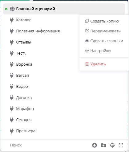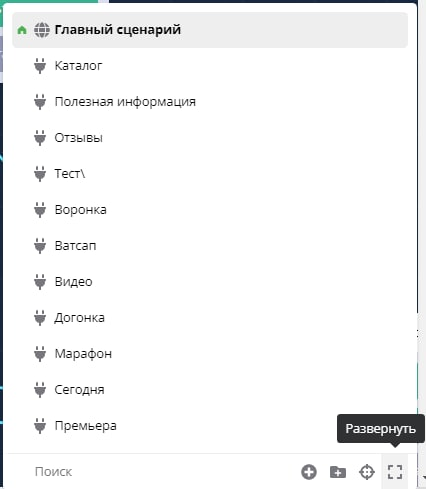 We have an excellent tool for managing bot scenarios — storing scenarios in the form of a tree with the ability to create folders and put scenarios in them. But until now, in the "Scenario" block, autoresponder step or in prepared phrases, you could only select a scenario in the form of a linear list. Now this is presented in a convenient structure in all sections where there is scenario selection: