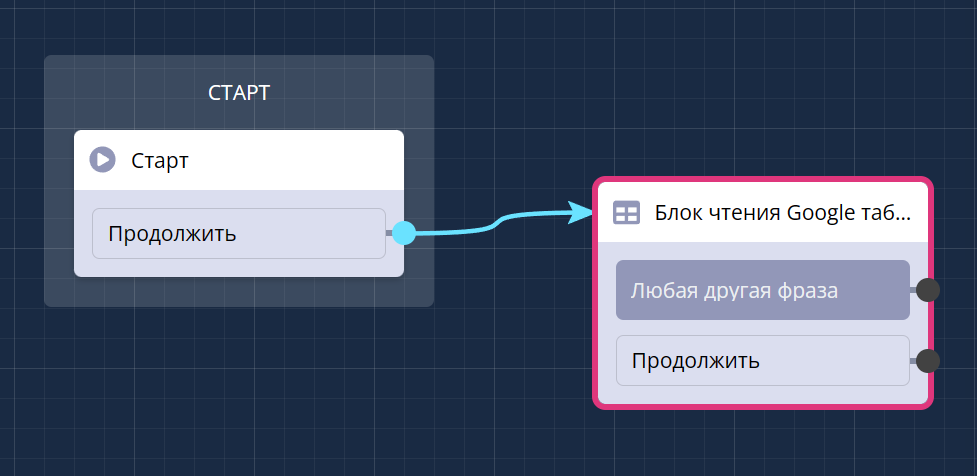 Блок чтения Google таблицы позволяет читать данные из Google таблицы, фильтровать их по определенным условиям, сохранять результаты в переменные и выводить их в бот. Для этого необходимо: