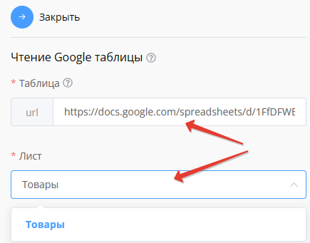 - Выполнить интеграцию с Google таблицами, как описано в разделе интеграция с Google Таблицами