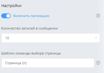 Когда записей много, вы можете включить постраничную навигацию и настроить количество записей для отправки клиенту. Так же вы можете задать произвольный шаблон для выбора страницы, где {n} обозначает номер страницы. Например клиент отправляет боту команду «Страница 2» и бот в ответ присылает еще 10 записей со второй страницы списка.