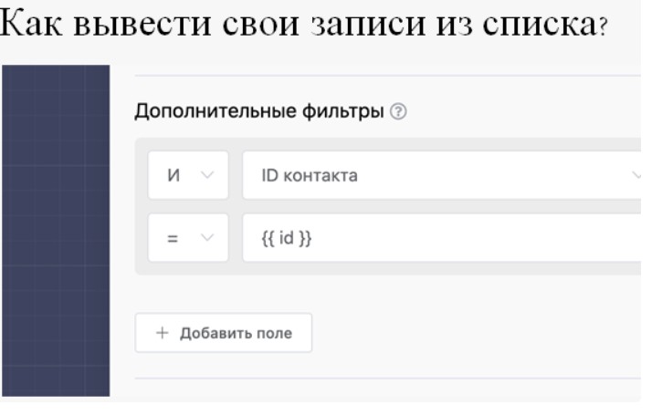 Вы можете фильтровать данные по своему ID. Например, если в списке хранятся записи, связанные с вашим контактом, ты вы можете сделать выборку этих записей. Для этого необходимо в дополнительных фильтрах написать константу «id» и вы получите выборку всех записей, где они имеют ваш ID контакт.