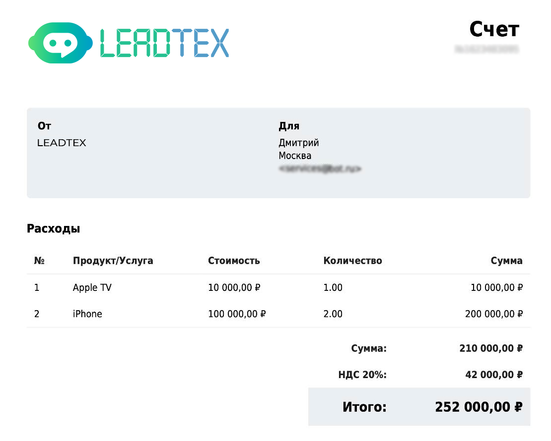 Иногда нужно отправить счет клиенту после оформления заказа. Просто включите необходимую опцию в блоке «Корзина», и наша система отправит счет в виде PDF-документа.