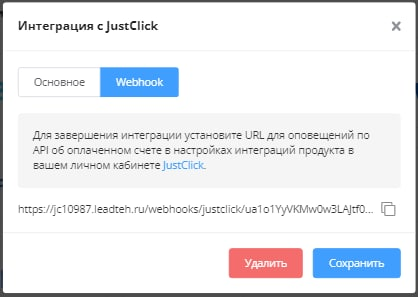 После сохранения настроек откройте вкладку Webhook и для завершения интеграции установите URL для оповещений по API об оплаченном счете в настройках интеграций продукта в вашем личном кабинете JustClick.
