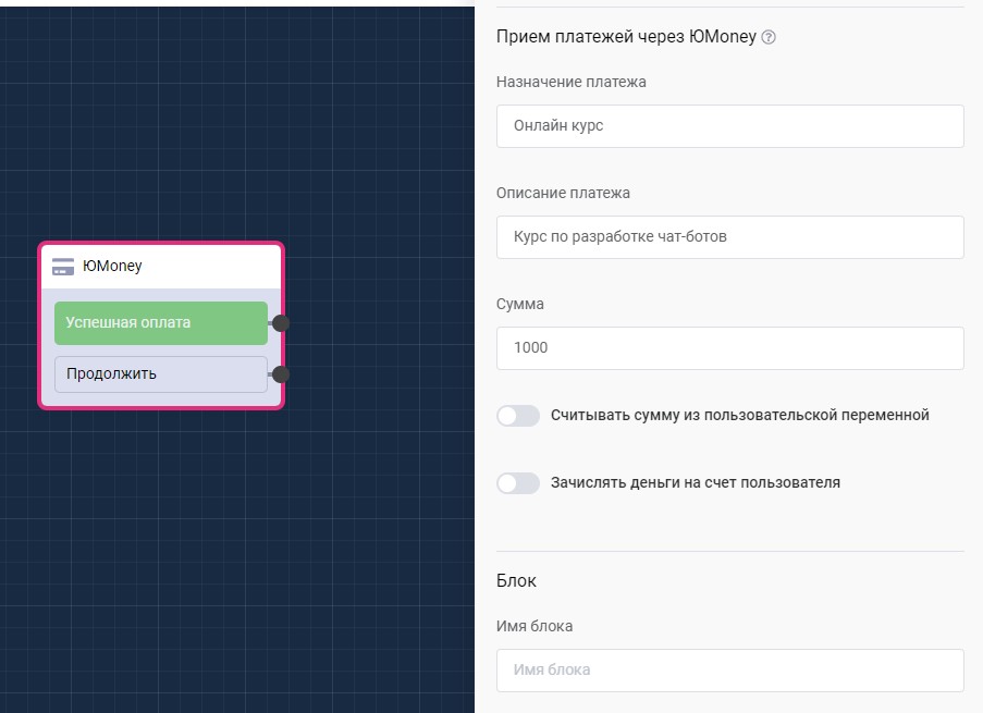 Блок "Прием платежей через ЮMoney" в сценарии