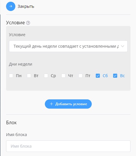 Тип условия "Текущий день недели совпадает с установленными днями"