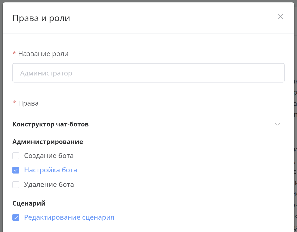 Также вы можете настроить доступ только к конкретным функциям конструктора, например, разрешить пользователю редактировать сценарий бота, но не разрешать удалять его.