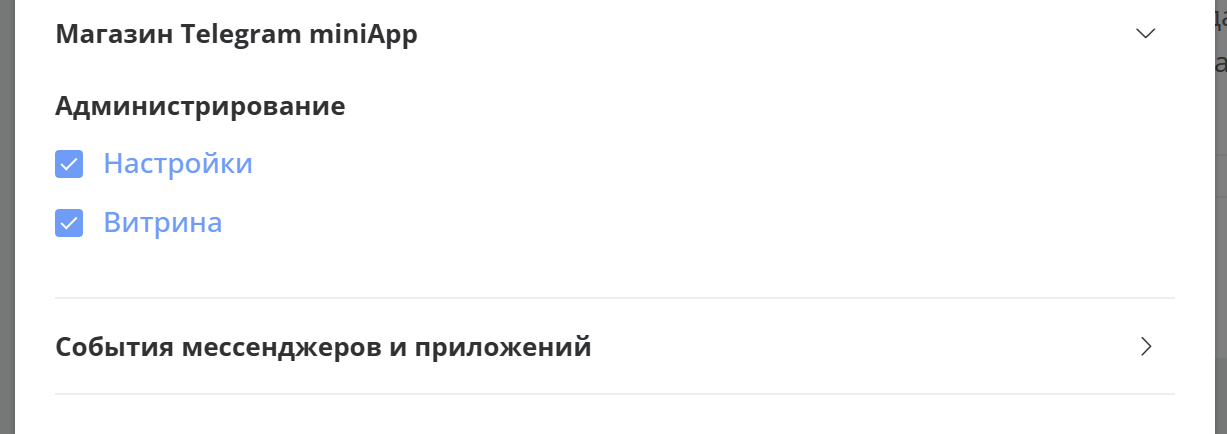Права к MiniApp настраиваются в разделе "Магазин Telegram miniApp":