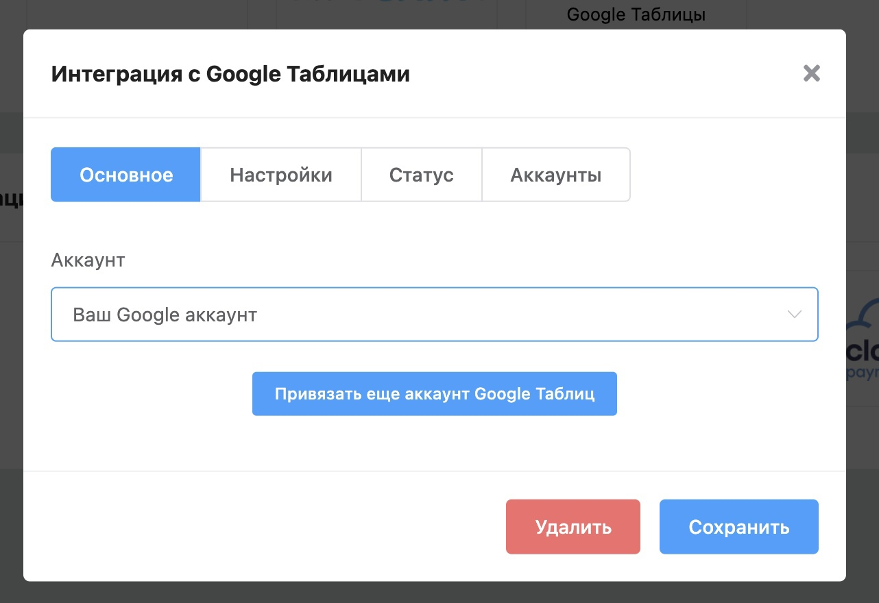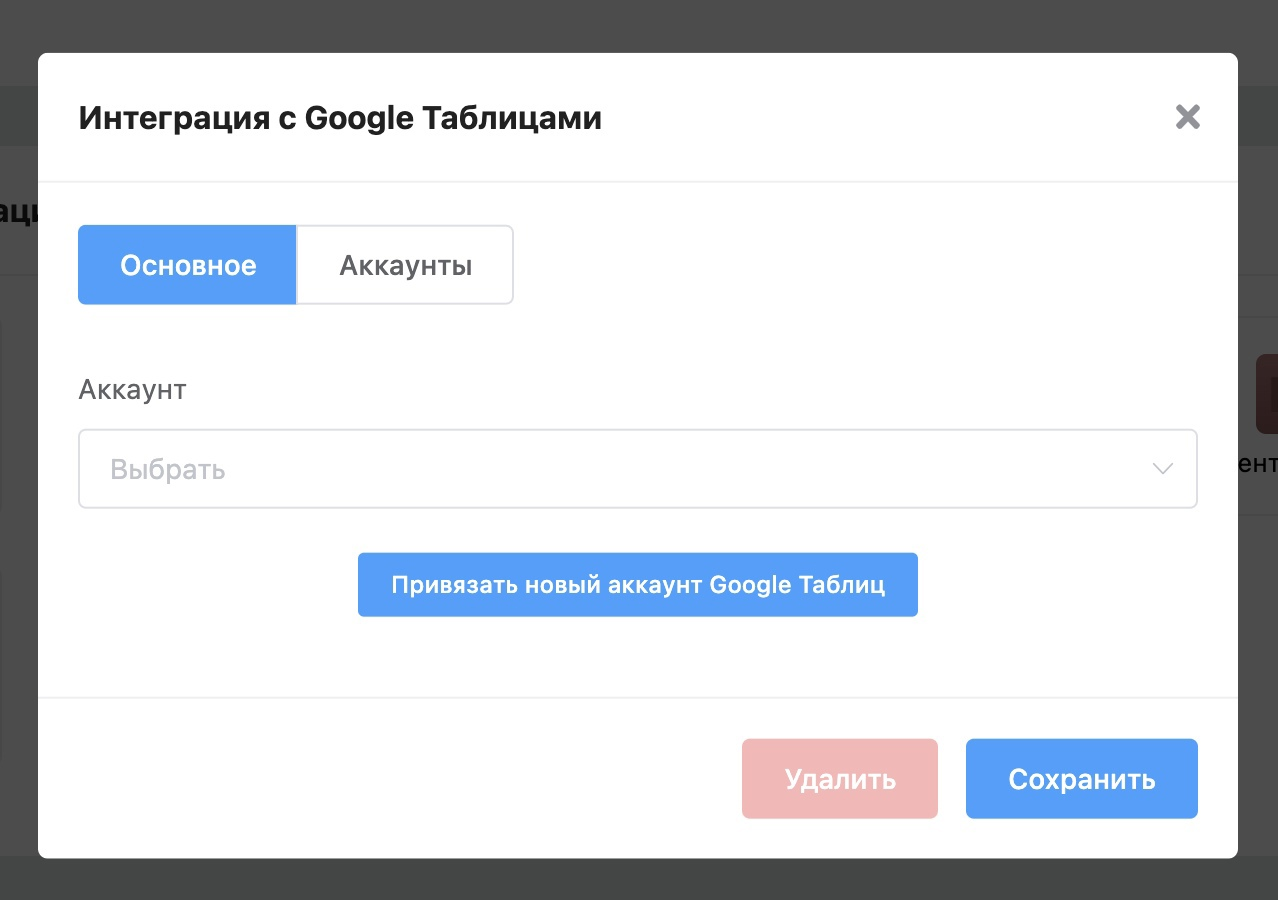 - Нажмите на кнопку «Привязать новый аккаунт Google Таблиц» и пройдите окно авторизации.
