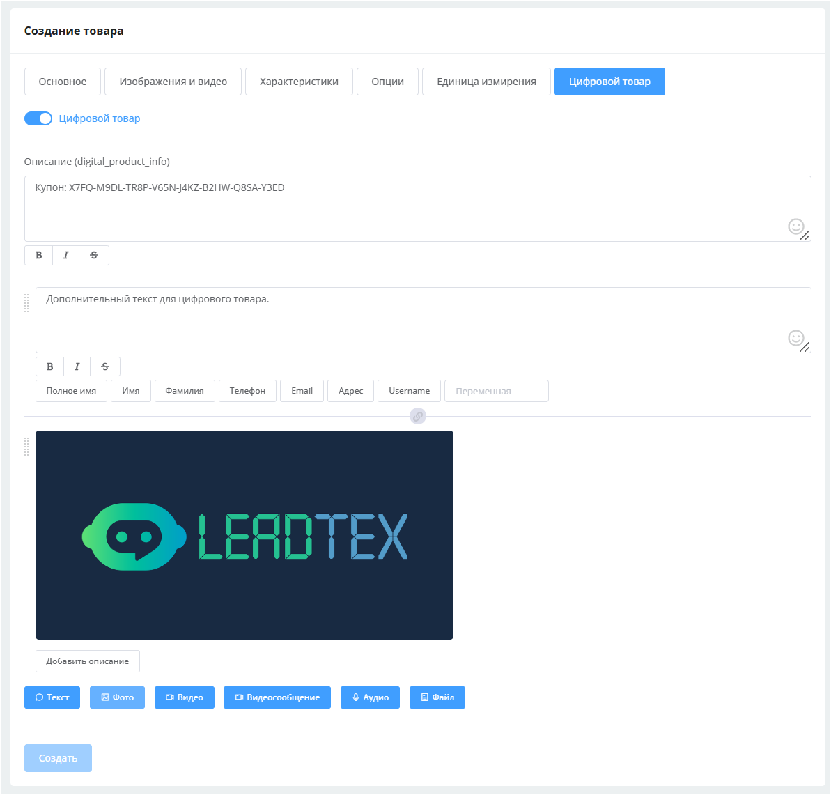 Создание и настройка цифрового товара