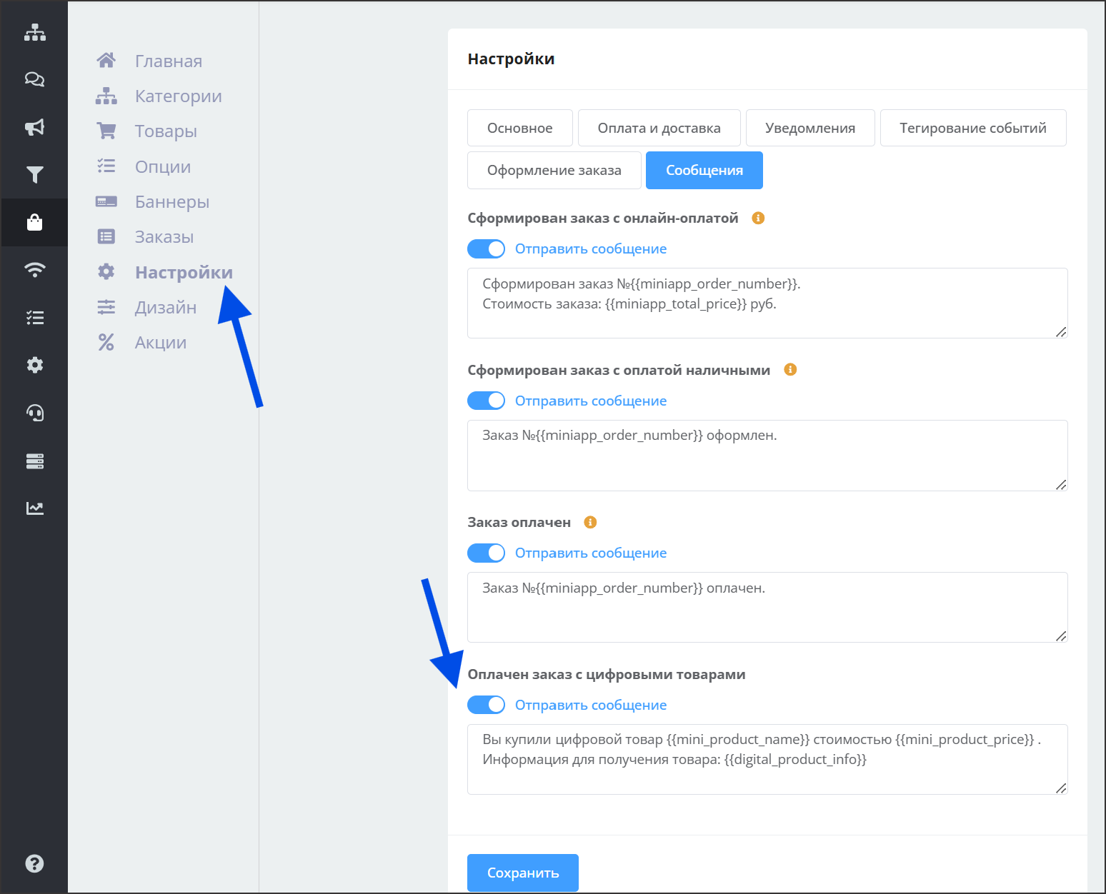 Шаблон сообщения для цифровых товаров настраивается в разделе "Настройки" на вкладке "Сообщения".