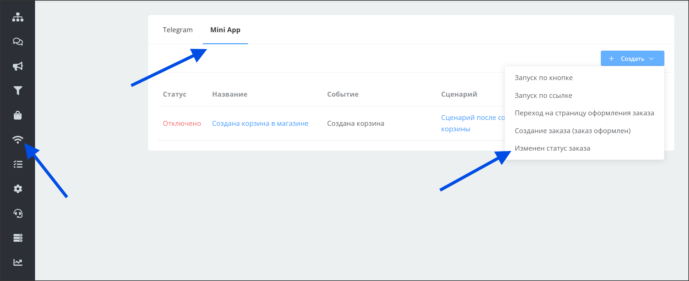 Перейдите в раздел события, вкладка Mini App и выберите событие "Изменен статус заказа". В настройках события выберите соответствующий сценарий (см. события магазина MiniApp).