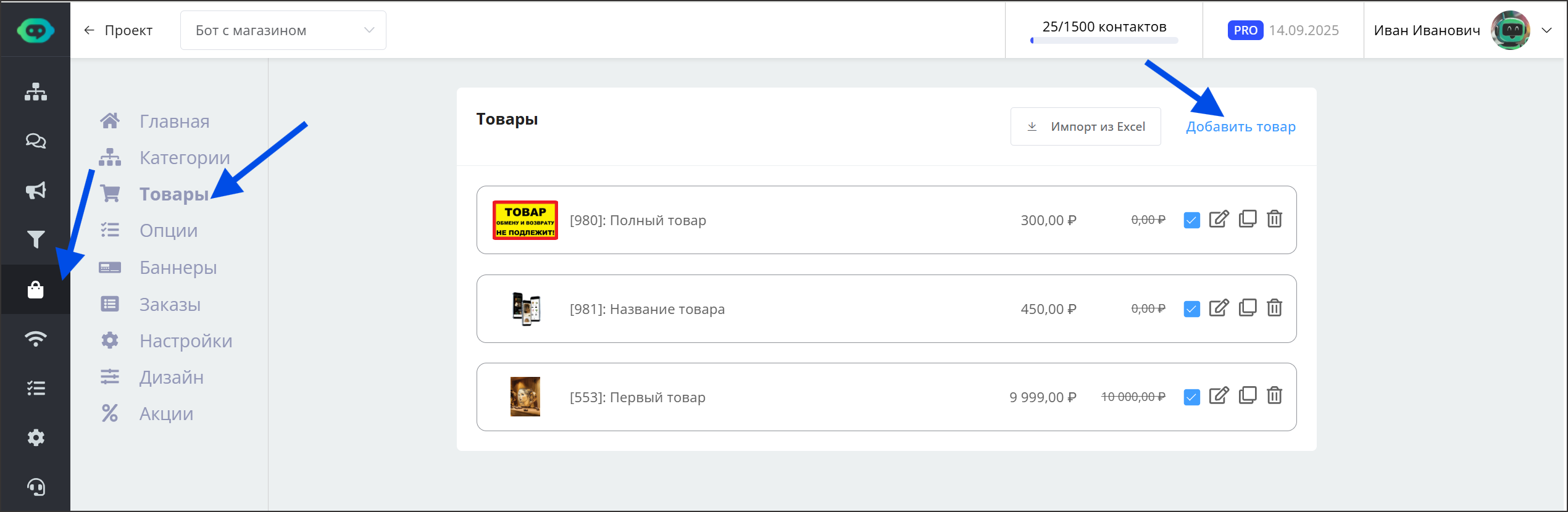 Перейдите в "Магазин" в раздел "Товары" и нажмите "Добавить товар".