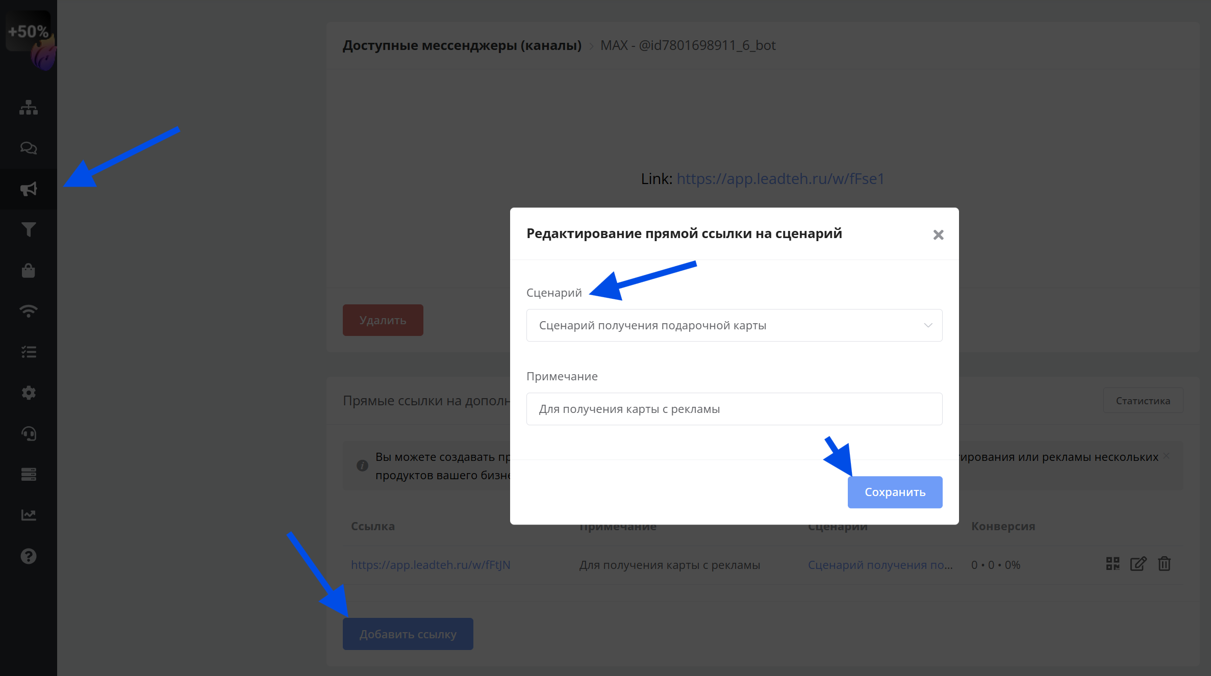 Затем нажмите Добавить ссылку. В открывшемся окне выберите сценарий для запуска по этой ссылке и нажмите Сохранить. При необходимости добавьте примечание к ссылке.