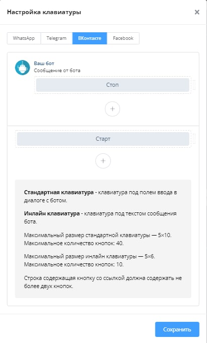 Боты ВКонтакте поддерживают кнопки, а мы со своей стороны сделали поддержку редактора этих кнопок.