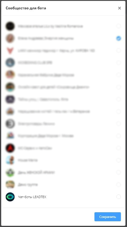 Выбор сообщества ВКонтакте для подключения чат-бота