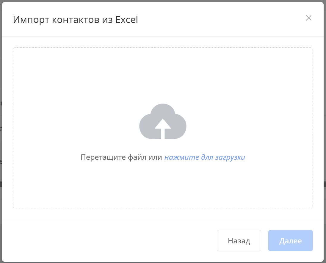 На втором шаге перетащите файл Excel в область загрузки или выберите его с компьютера. Поддерживаются типы: .xls, .xlsx.