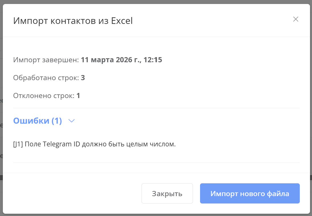 По окончании импорта отобразятся результаты импорта. Если в файле были обнаружены некорректные данные, они выводятся в раскрывающемся блоке Ошибки с указанием количества. По ним можно скорректировать файл и загрузить его снова (см. Частые ошибки в файле импорта).